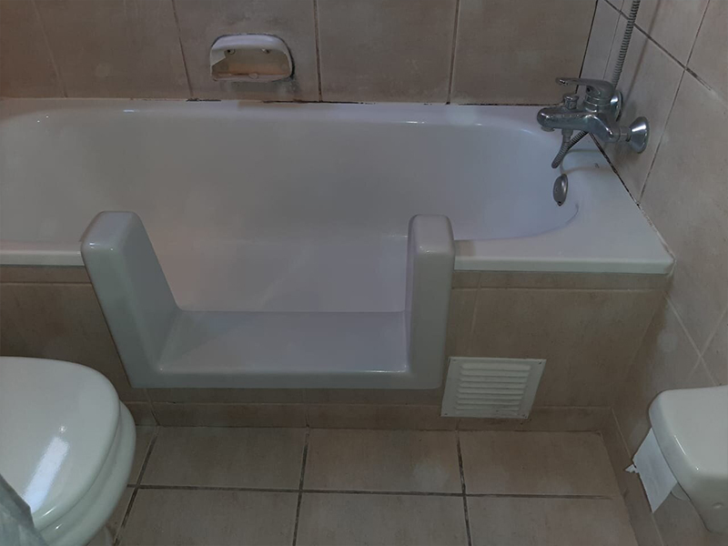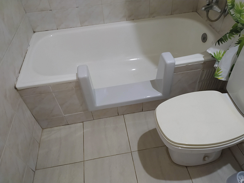Consiste en cortar un tramo de la tina dejando una pasada de 50 cm de ancho y se coloca un marco de fibra de vidrio alrededor. Así se baja considerablemente la altura de acceso a la tina, con la consiguiente facilidad para aquellas personas que por cualquier razón les cuesta entrar y salir de la tina.